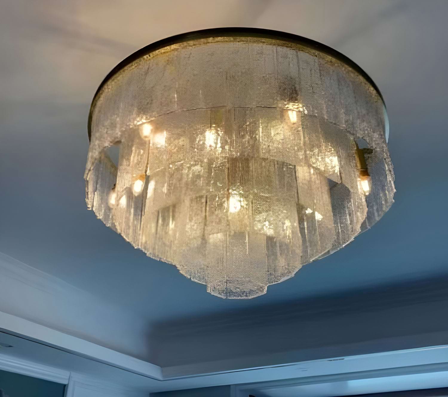 I bought this for my living room when my fluorescent light died, and it’s perfect! I was glad it came with extra crystals since a few were chipped. There are even some left over.