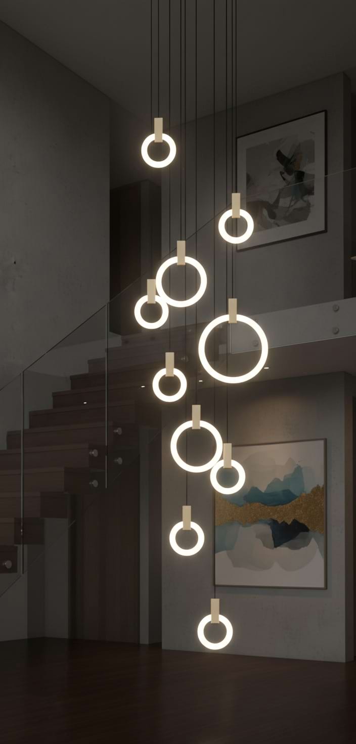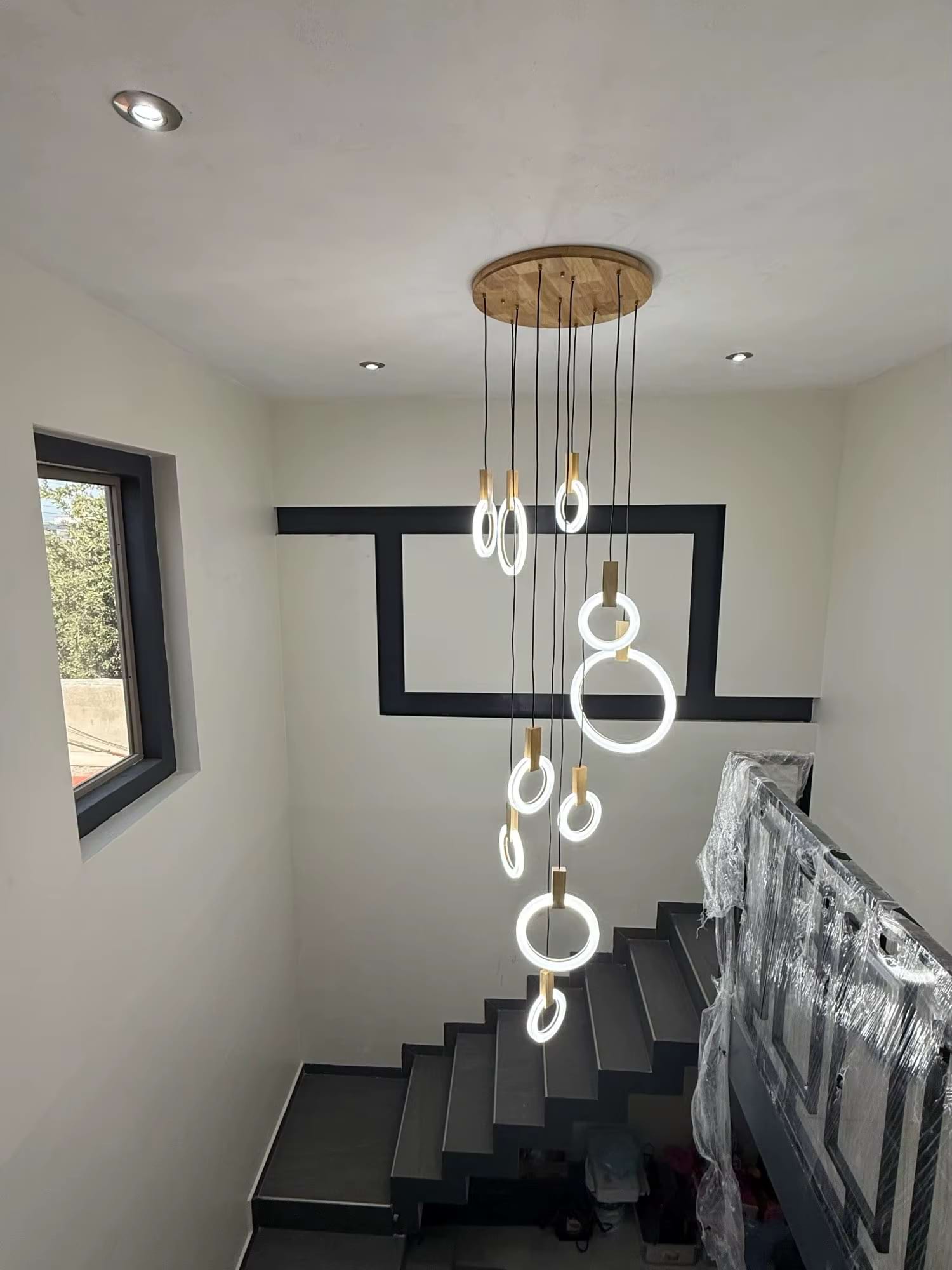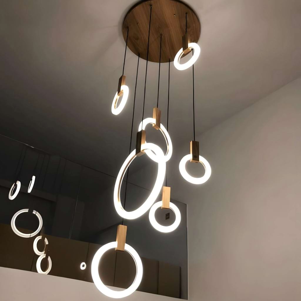 The fixture is eye catching and unique. We ordered the 10 rings. The size elevates it to a luxury level. Cannot wait to finish designing my house around this beautiful piece.