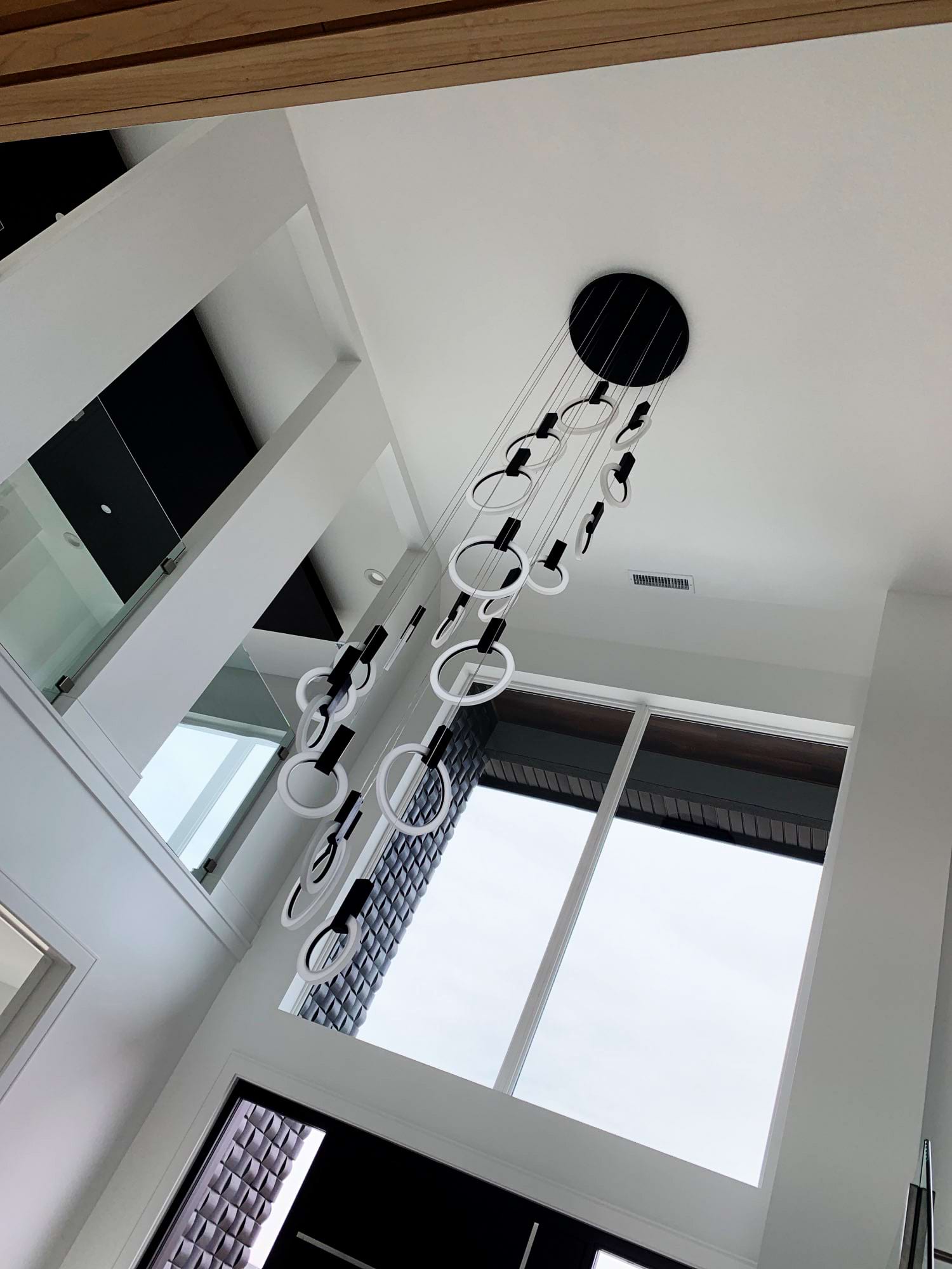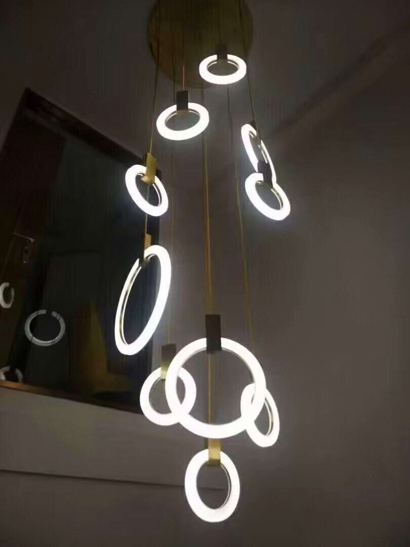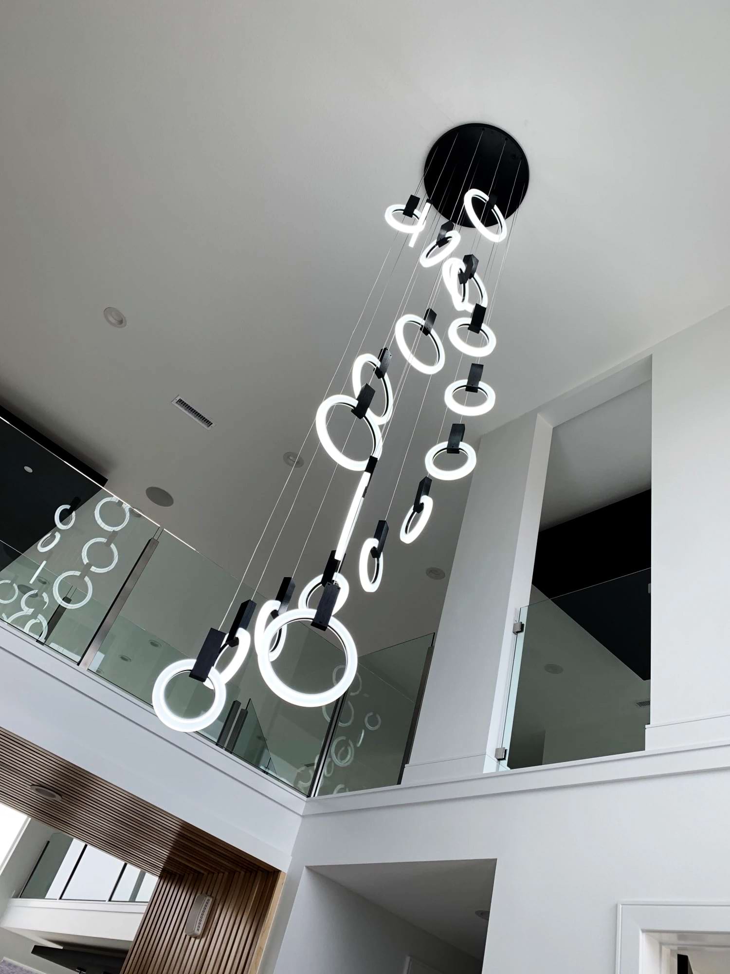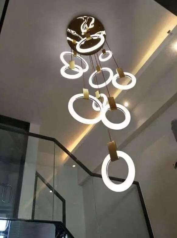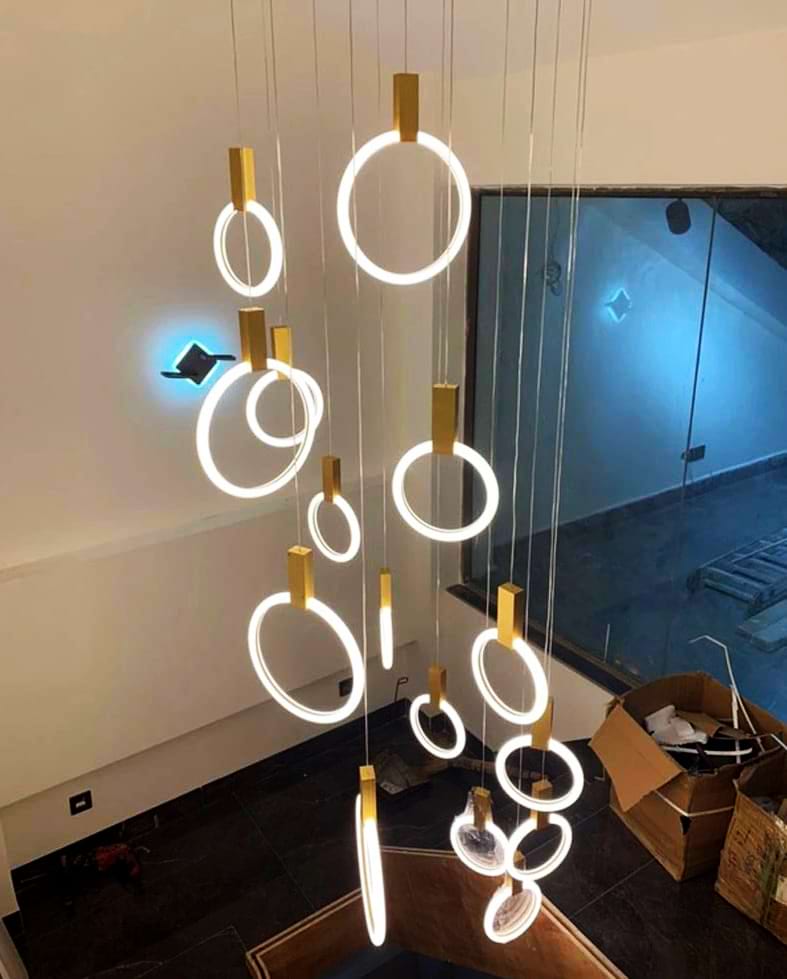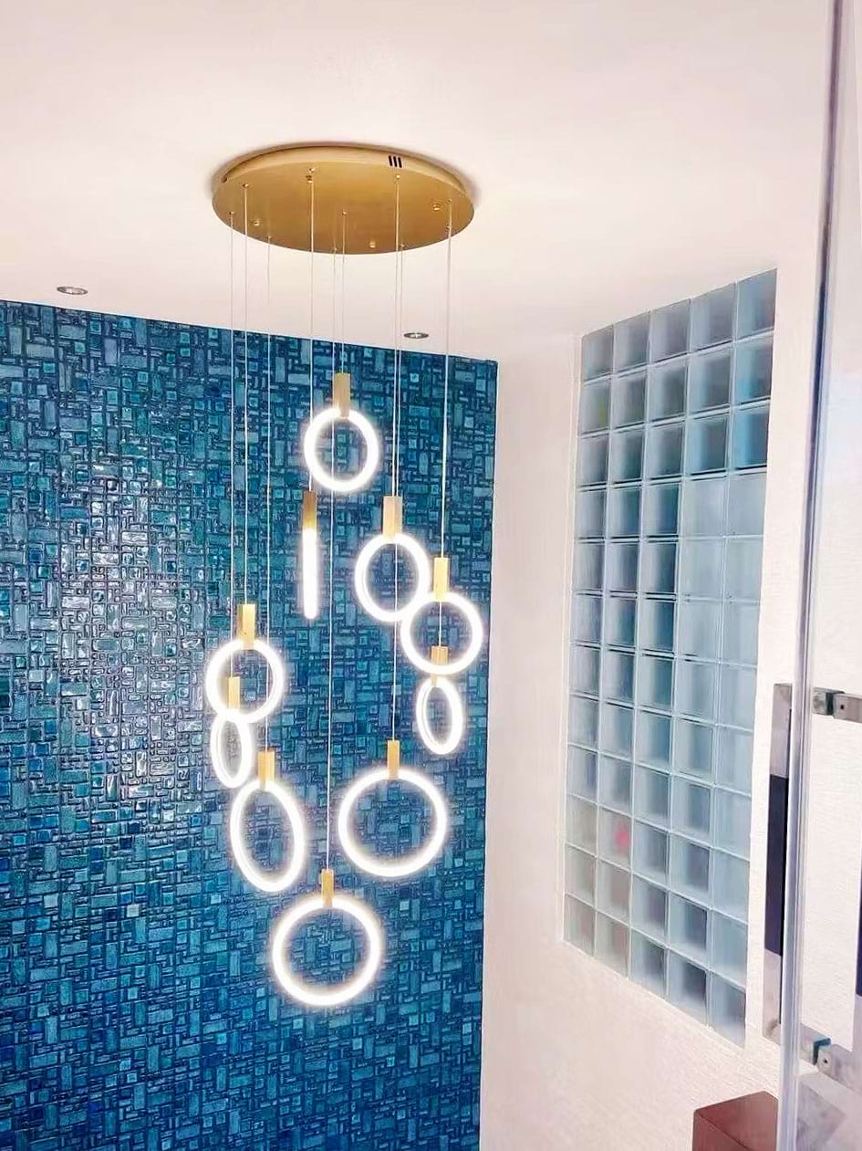 What makes the Jenne Modern Stairway Chandelier truly exceptional is its refined detailing and creative form. Offered in options from 3 up to 20 rings, each design presents a distinctive visual composition. The carefully aligned rings interact beautifully with the light, producing dynamic patterns and subtle shadows that fill the room with a sophisticated glow. With its captivating presence, this chandelier doesn’t just brighten a space – it transforms it into an atmosphere of modern luxury.