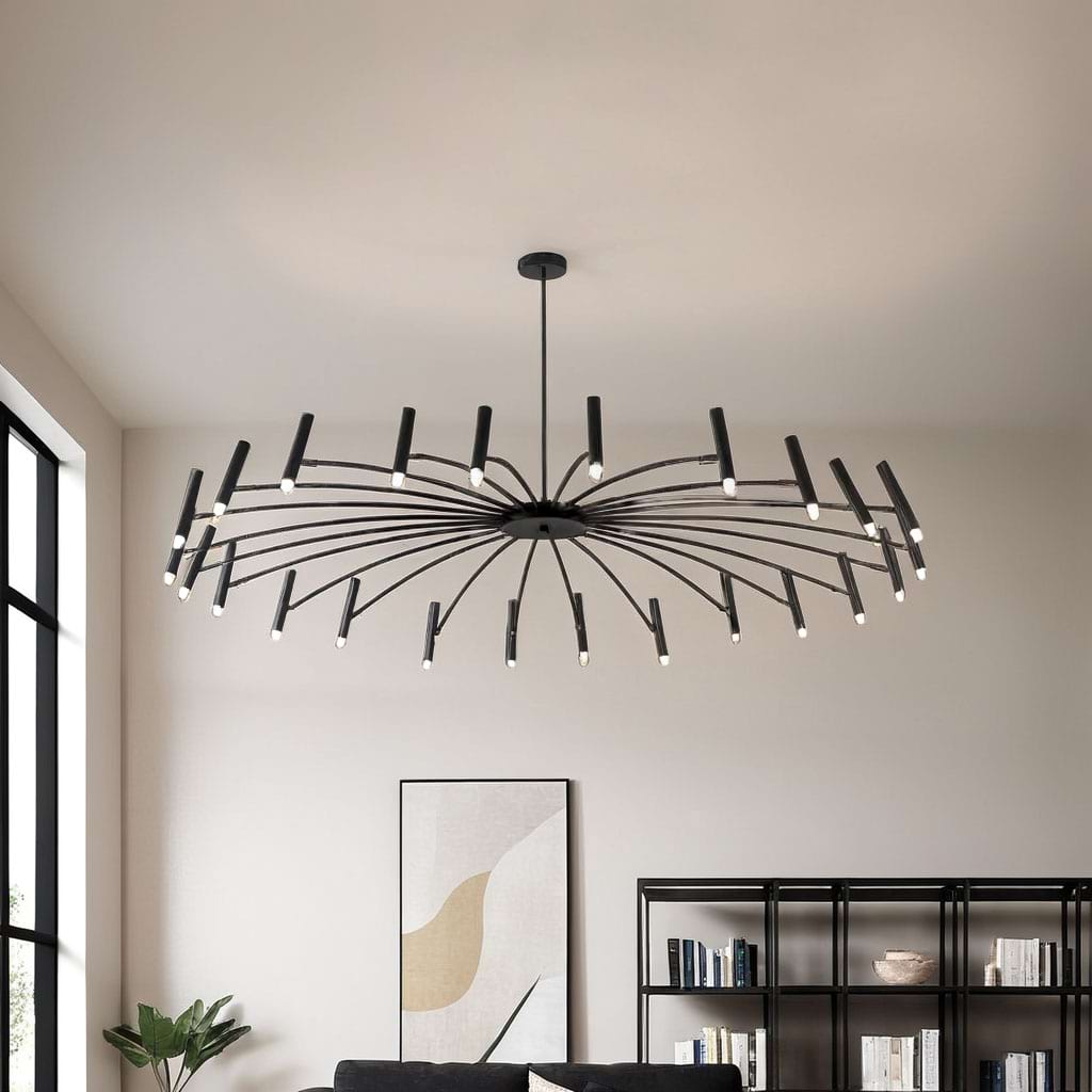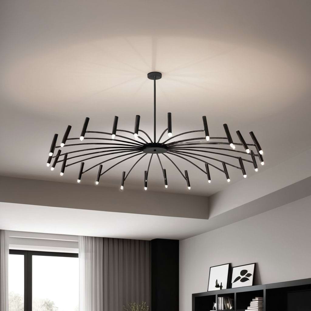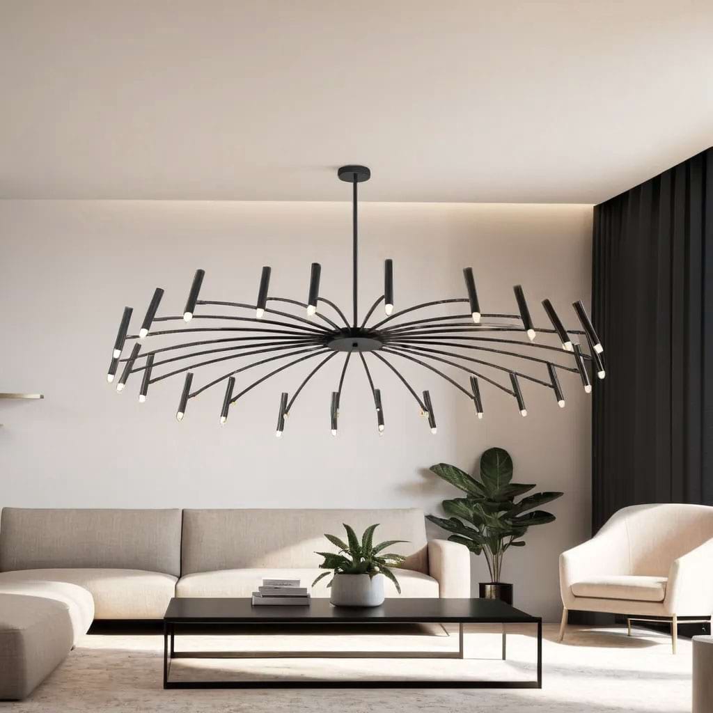 Our Modern Black Wagon Wheel LED Chandelier is a striking piece that evokes the wonder of a starlit night. Designed with clean, contemporary lines, it features slim arms extending gracefully outward, each ending with a softly glowing bulb that recalls the sparkle of distant stars. The smooth black finish pairs seamlessly with modern interiors, offering both refinement and a hint of celestial charm. Perfect for elevating a dining area or creating a dramatic welcome in an entryway, this chandelier combines understated elegance with captivating presence.