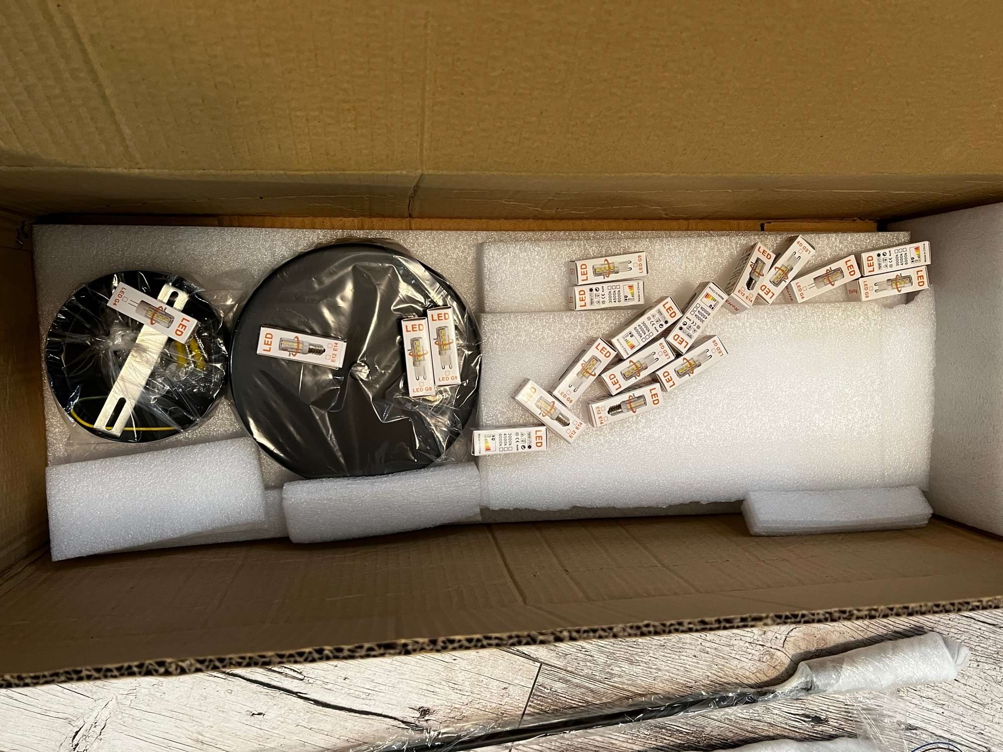 Hello. received the chandelier, the delivery was fast. Brought straight to the apartment. There was a dent on the box, it was good that it did not affect the product. Came in good condition, one issue is that the manufacturer did not form it to the end, I had to do it. The bulbs were included and to them a glove in order to insert them into the chandelier. I really like that the chandelier can be hung at different heights, we chose the shortest. The room is lit enough (18 sqm), we made it so that 50% lighting and 100% lighting can be used. Satisfied with the purchase, nice loft style. Chosen the white color of the chandelier body and neutral lighting. Recommend item. Thank you.