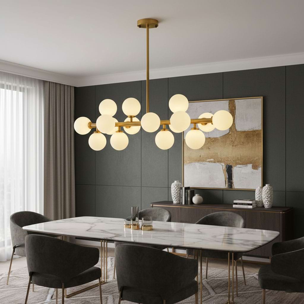 Introduce the Stroma Frosted Glass Chandelier. Bring a sense of calm and sophistication to any room with the Globe Chandelier, where modern design meets timeless elegance. Its smooth, rounded glass globes create a serene ambiance, offering a contemporary twist on the classic chandelier. Featuring 16 frosted globes arranged along a sleek gold rod, each globe gently diffuses LED light, filling your space with a soft, inviting glow. No harsh shadows, no focused beams—just effortless, high-end illumination that transforms your room into a stylish sanctuary.